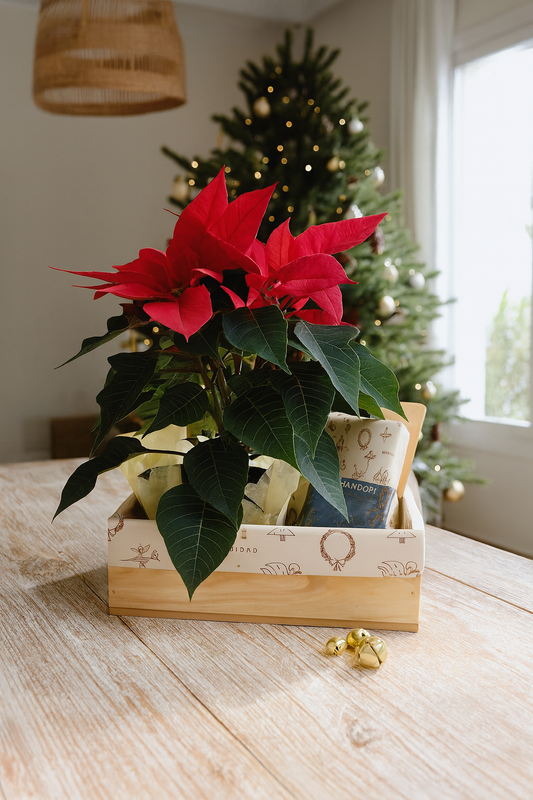 Regalo navideño con Poinsettia, café y pan de masa madre