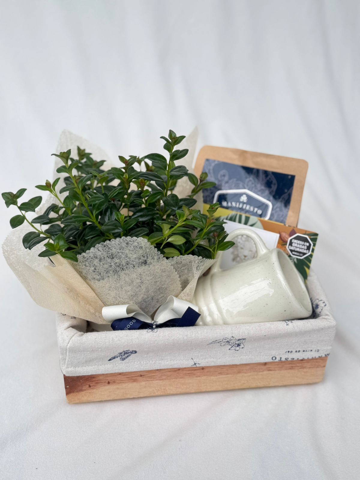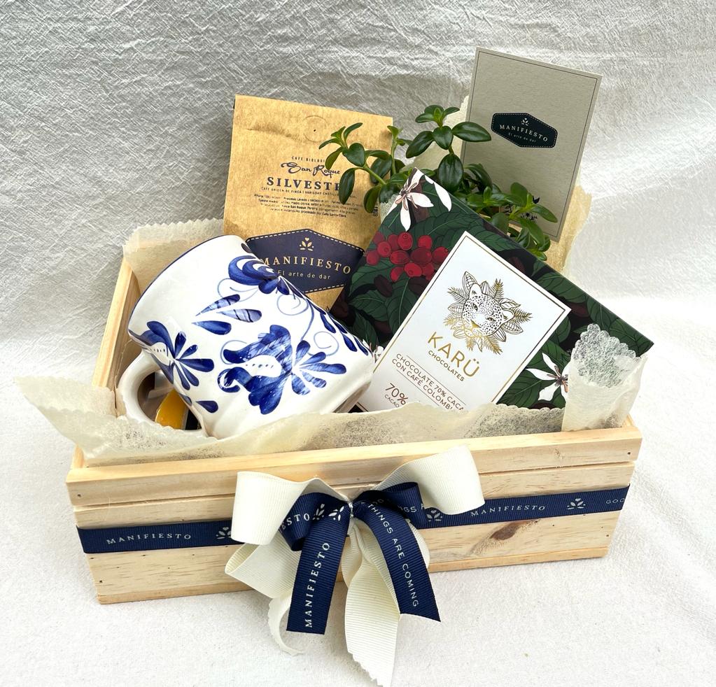 Guacal con Planta Pescadito, Café Artesanal, Chocolate y Mug Pintado a Mano