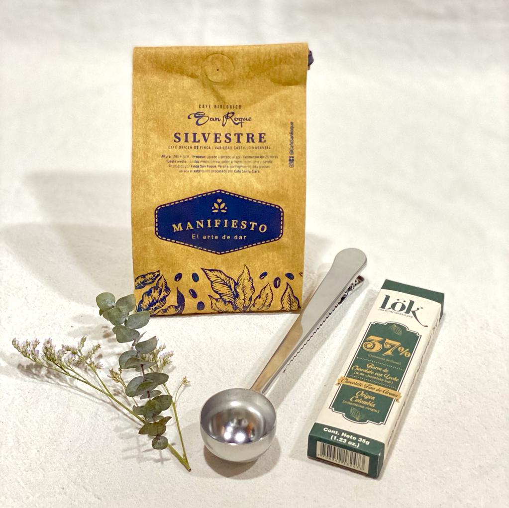 Este set incluye 250 g de café artesanal, una cuchara metálica medidora para la dosis perfecta, y un chocolate Mini Lok para acompañar el café. Todo presentado de manera cuidadosa, ideal para regalos corporativos