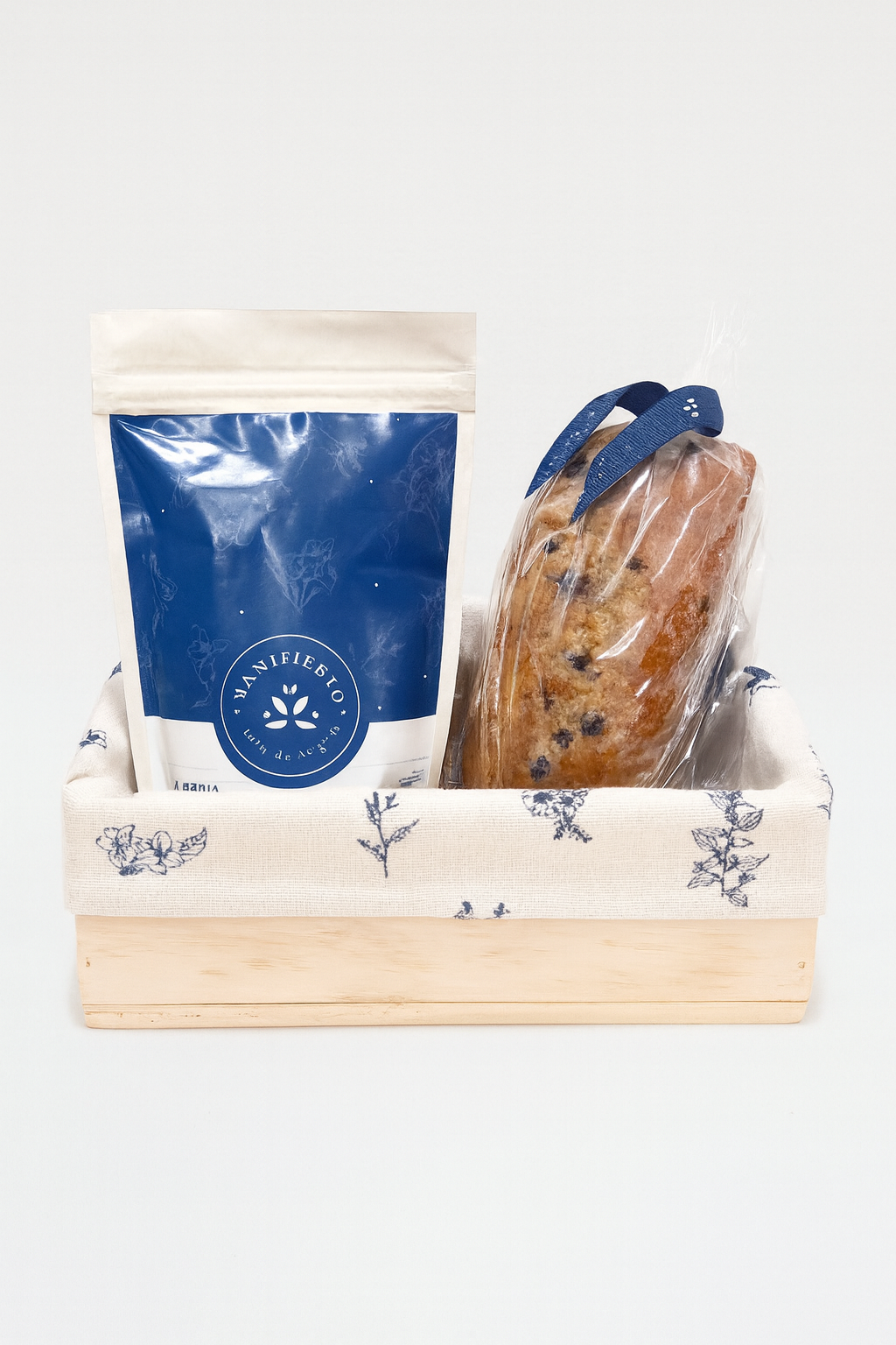 Caja de madera reutilizable con forro en algodón, un pan un pan de canela o chocolate artesanal sin conservantes y un café de 250 gr artesanal.