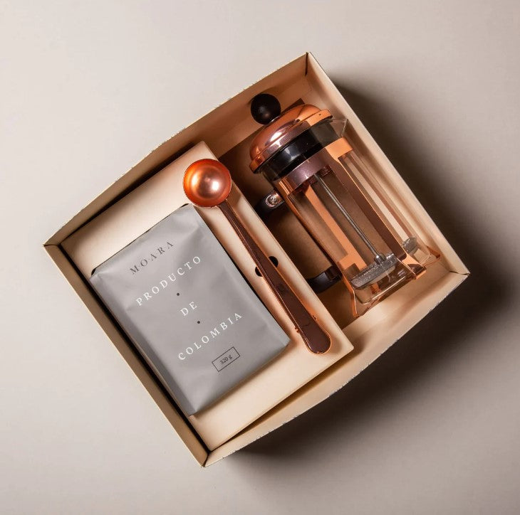 Un regalo elegante y práctico, ideal para regalos corporativos o para sorprender a los amantes del café. Incluye una prensa francesa, un paquete de café artesanal y gourmet de 320g y una cuchara metálica medidora, todo presentado en una caja lista para regalar.
