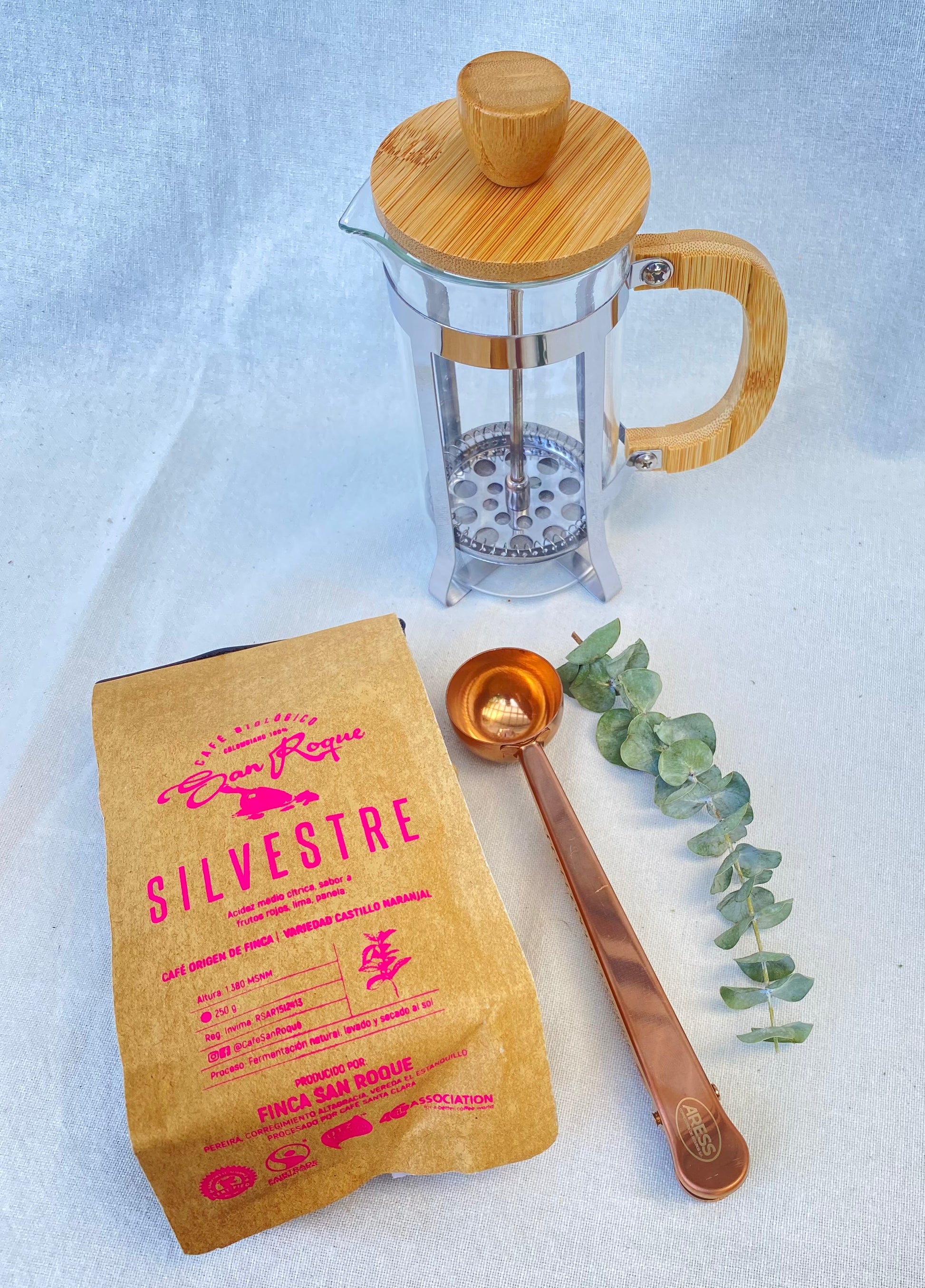 Prensa de Bamboo, café artesanal de 250 gr y cuchara medidora
