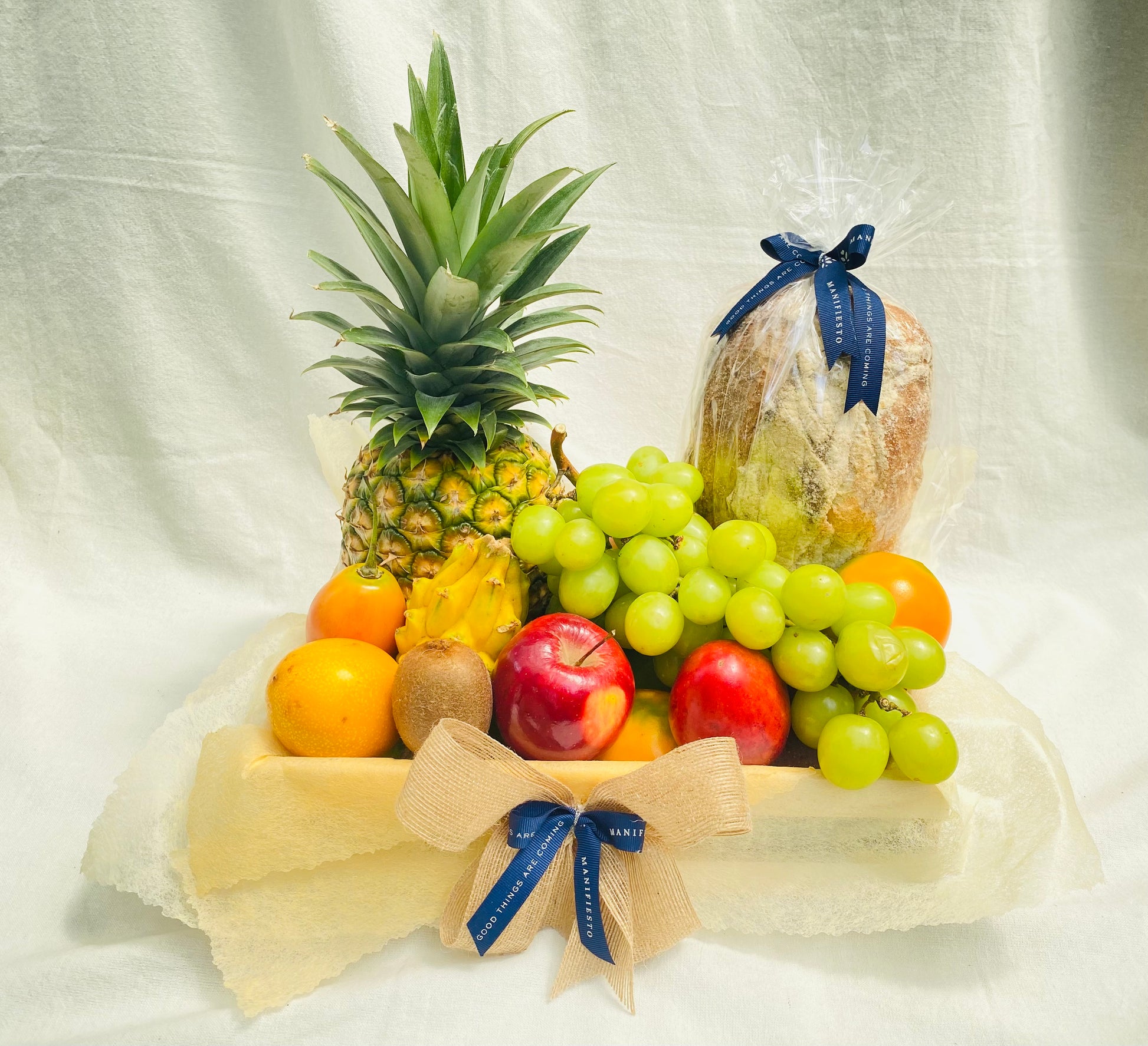 Una selección de frutas de temporada, elegidas de temporada para lograr frescura y variedad. Perfecta para regalar en cumpleaños, condolencias o deseos de pronta recuperación, transmitiendo cariño a través de un gesto sencillo y especial. En caja de madera con un pan de campo artesanal.