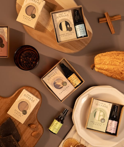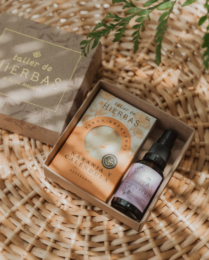Brumas con aceites esenciales y un jabón de ingredientes naturales en una cajita