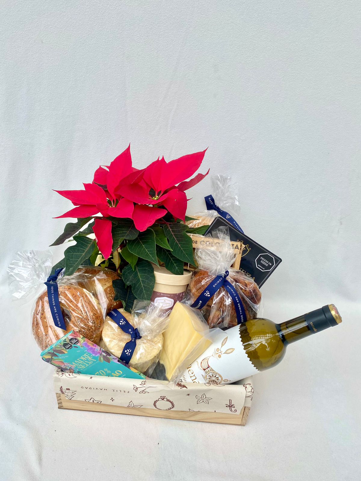 Celebra la Navidad con este guacal lleno de sabor y encanto artesanal. Incluye una poinsettia real, panes artesanales, vino, brownies melcochudos, una cuña de queso madurado, jamón curado, chocolate artesanal y conservas.