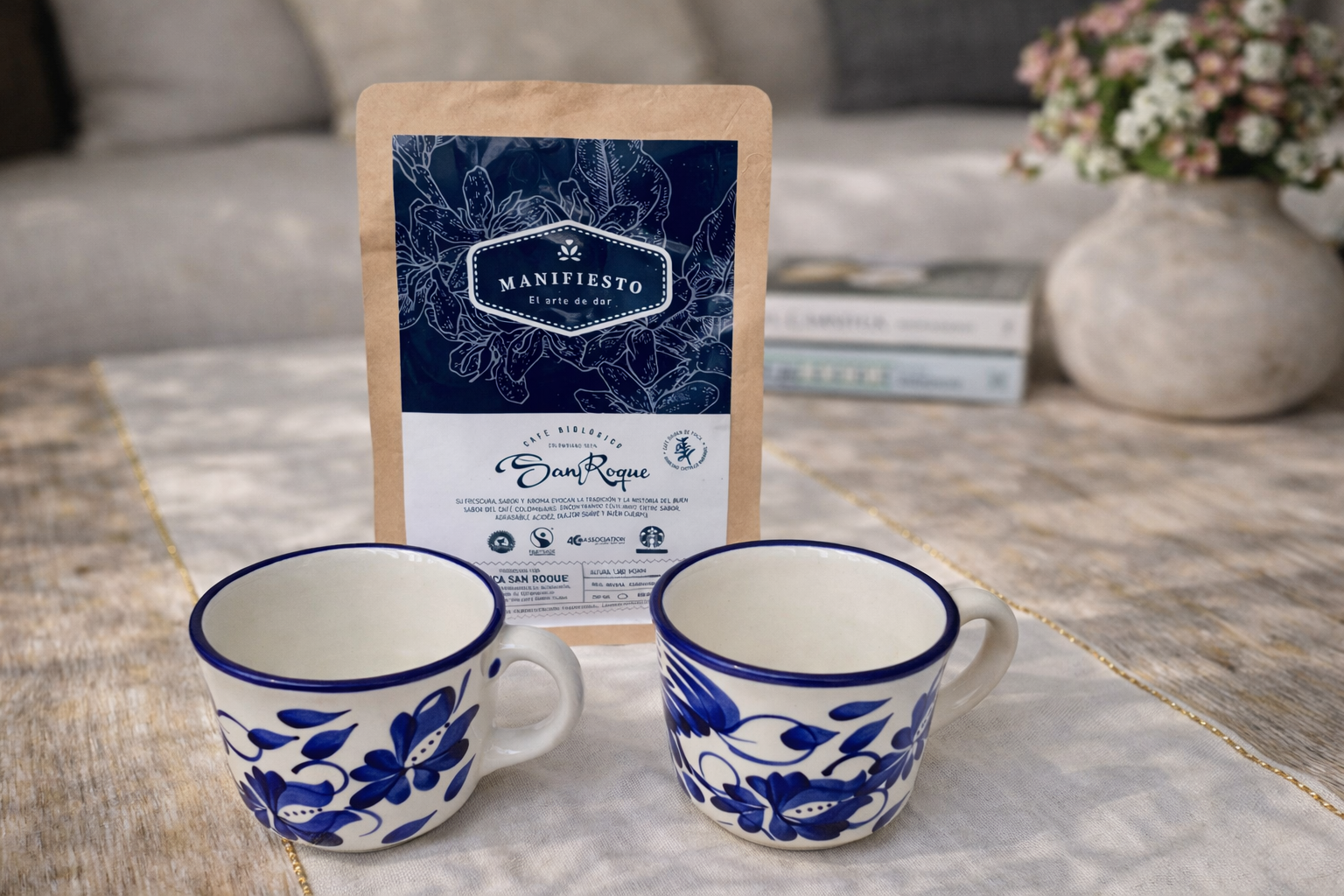 - Dos tacitas de tinto: Hechas a mano en cerámica de El Carmen de Viboral, un símbolo de arte y cultura colombiana.