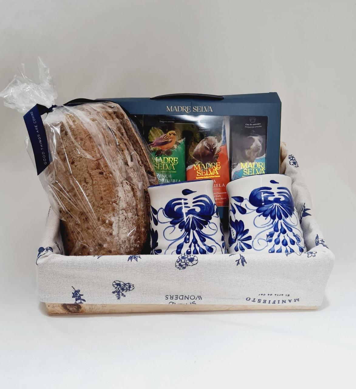 Caja de madera con algodón reciclado para seguir utilizando, una selección especial de cafés artesanales de 70 gr que conservan la fauna nativa en cada una de sus fincas con sabores y toques diferentes, Pan de masa madre hecho sin conservantes y dos mugs de El Carmen de Viboral.